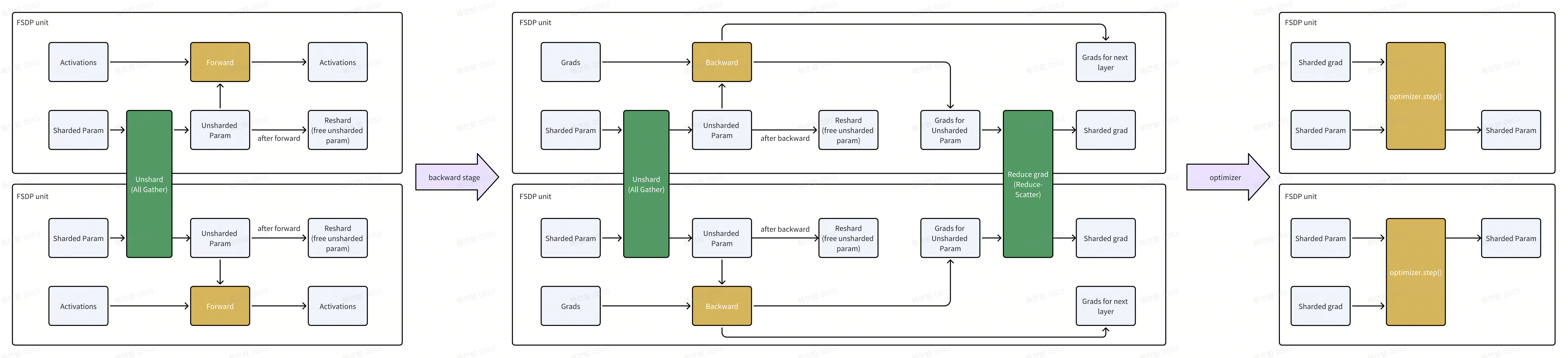 - Module computation阶段,使用unsharded param做计算。