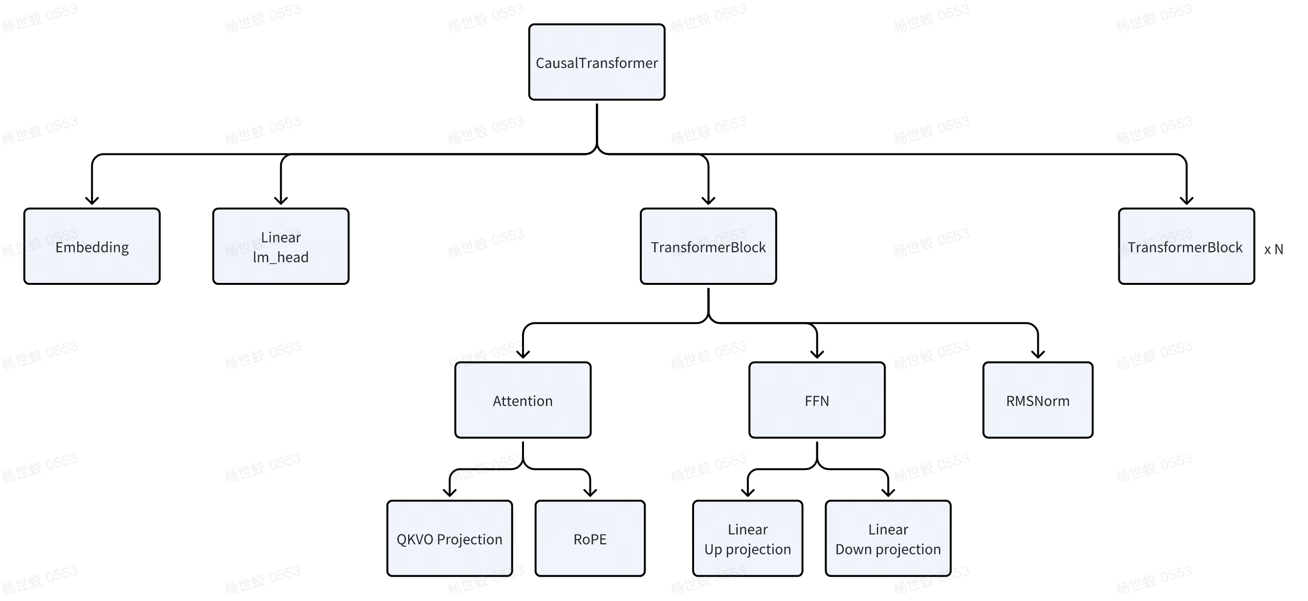 - 以一个CausalTransformer为例,模型会被组织成一个树形的结构。每一个节点都会有自己的Parameter,定义自己的forward计算逻辑。