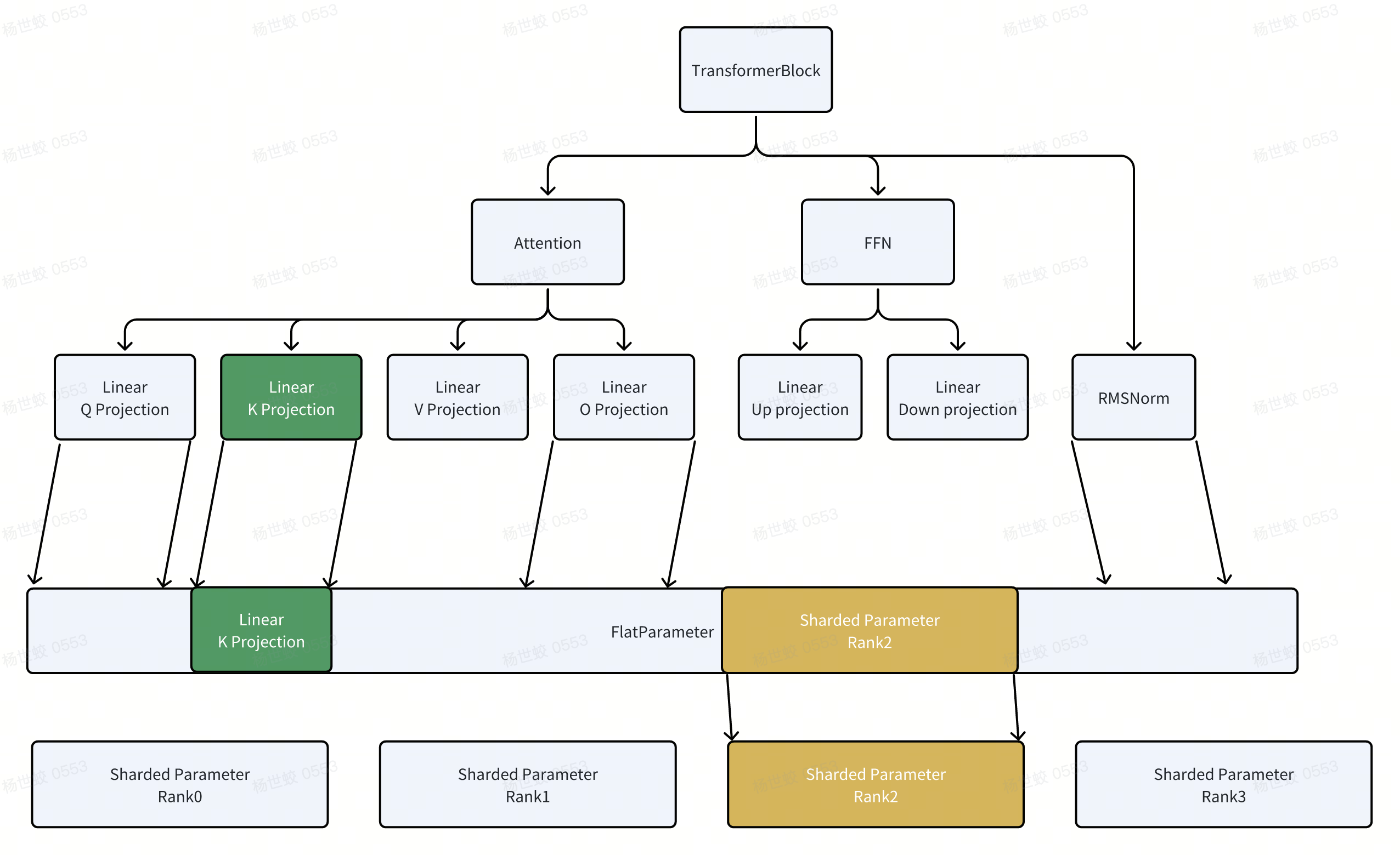 - 核心思路是把所有的参数拍平,都放到FlatParameter中。然后再根据world size去切分FlatParameter,每一个rank拿到一部分的FlatParameter。