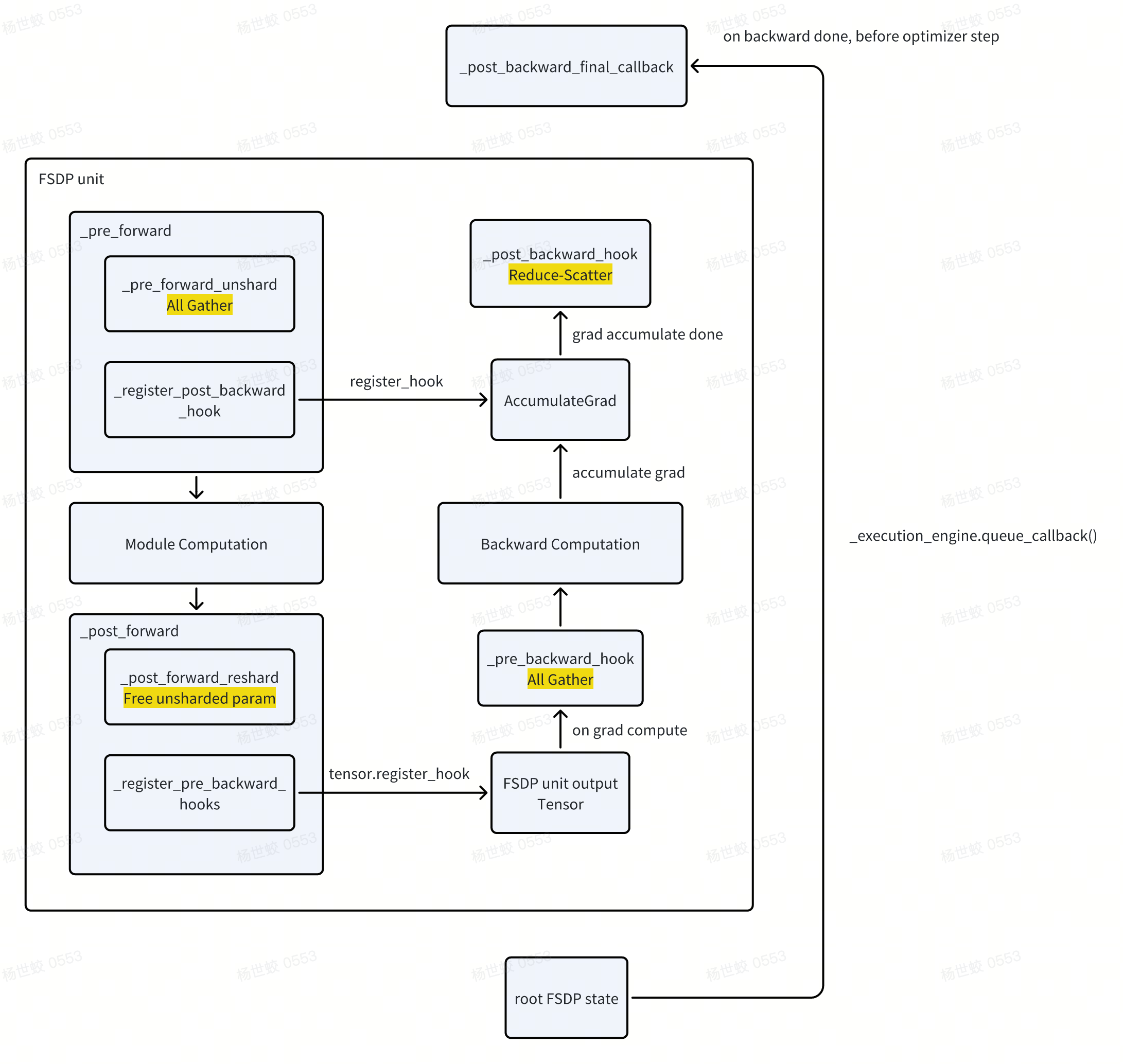 FSDP wrap了原始模型,在forward链路增加了pre-forward/post-forward的逻辑。