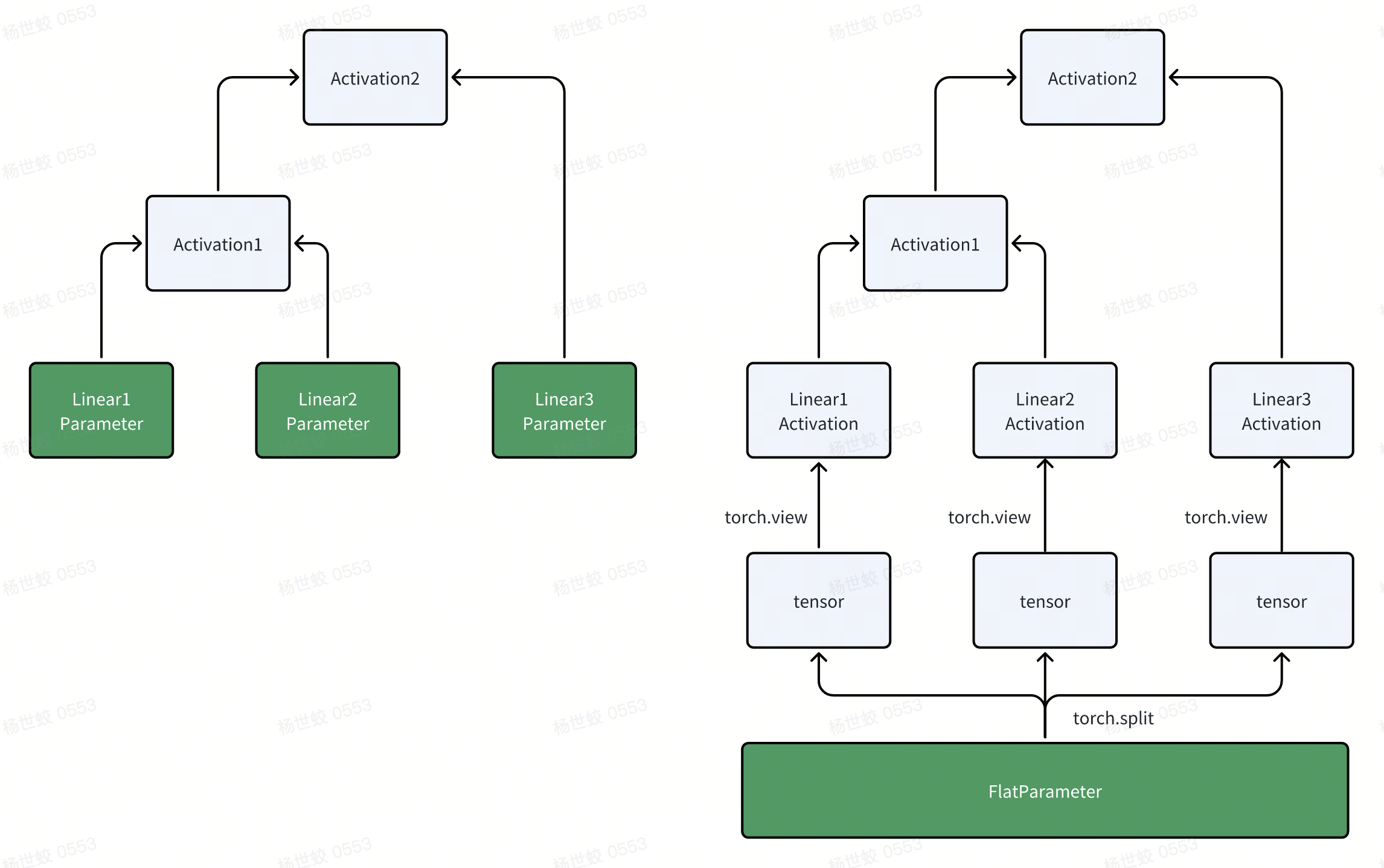 因为这些split/view也是会被autograd处理的,那么在反向传播的时候,梯度会自动从上面原始模块的参数Tensor中传播,直到下面的FlatParameter。