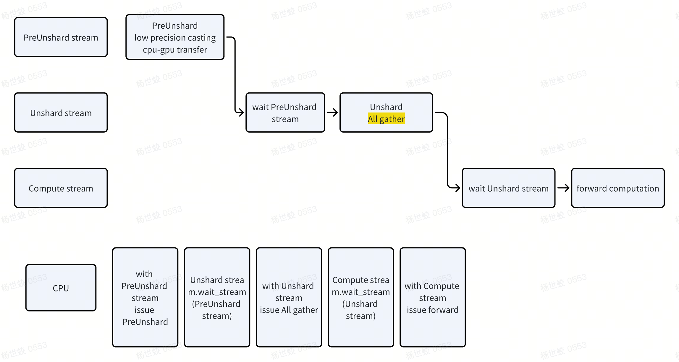 - PreUnshard stream使用的是precision casting的资源(不知道是不是独立的),以及cpu-gpu的移动(PCIE的带宽)