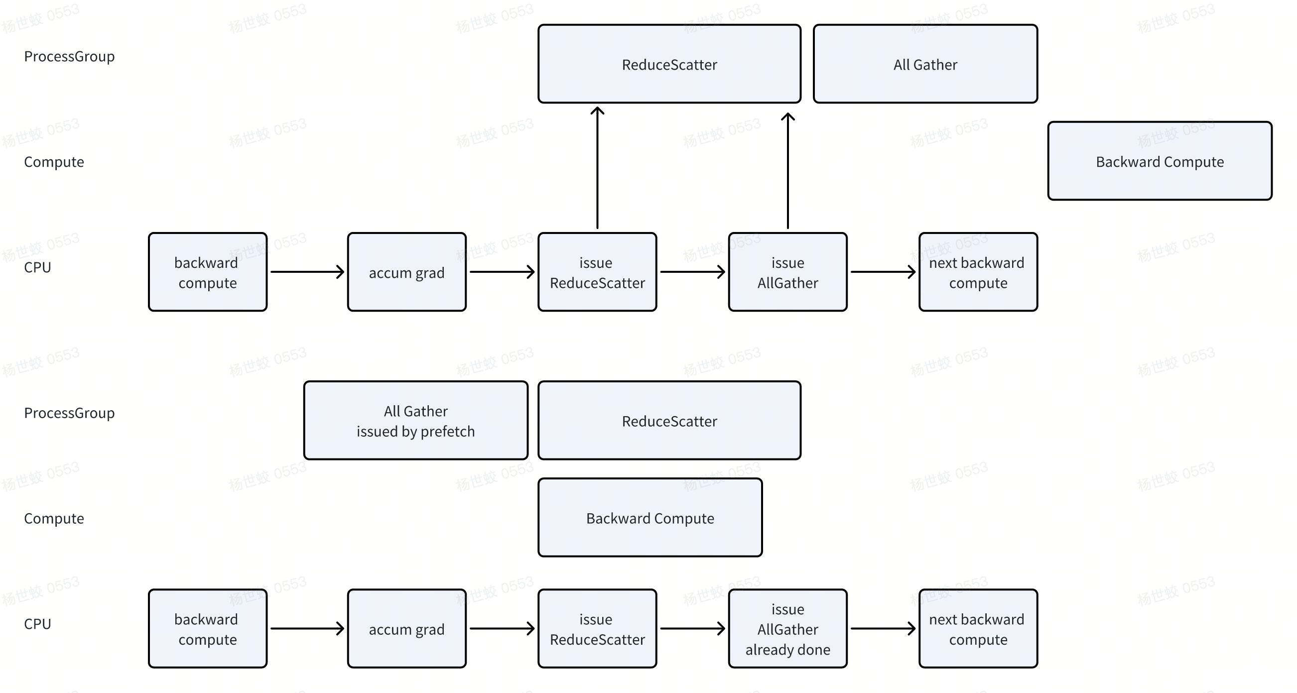 所以做一下prefetch可以先发起All Gather,让后面的Backward compute和当前的ReduceScatter并行。