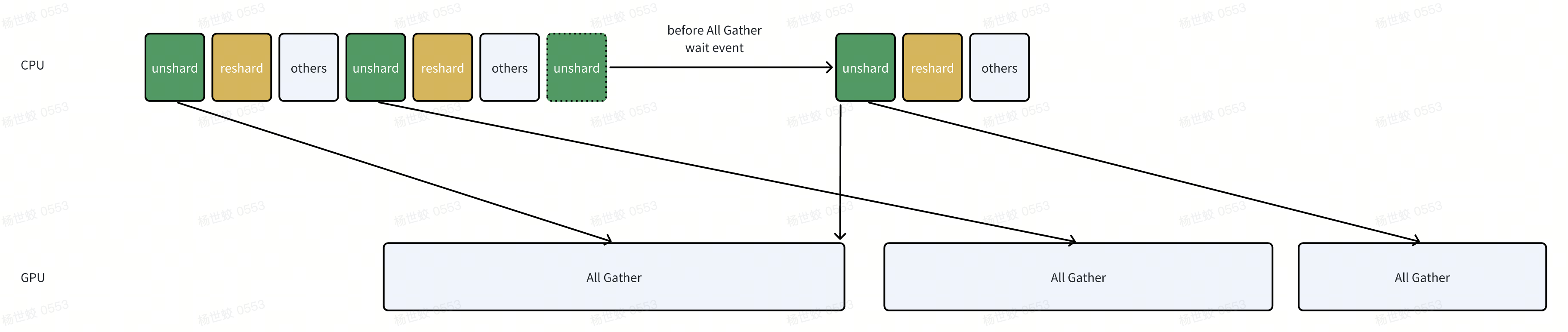 - 因为CPU的执行一般快于GPU,所以按顺序执行forward的时候,后面FSDP unit的All Gather都已经被提前发起了。
