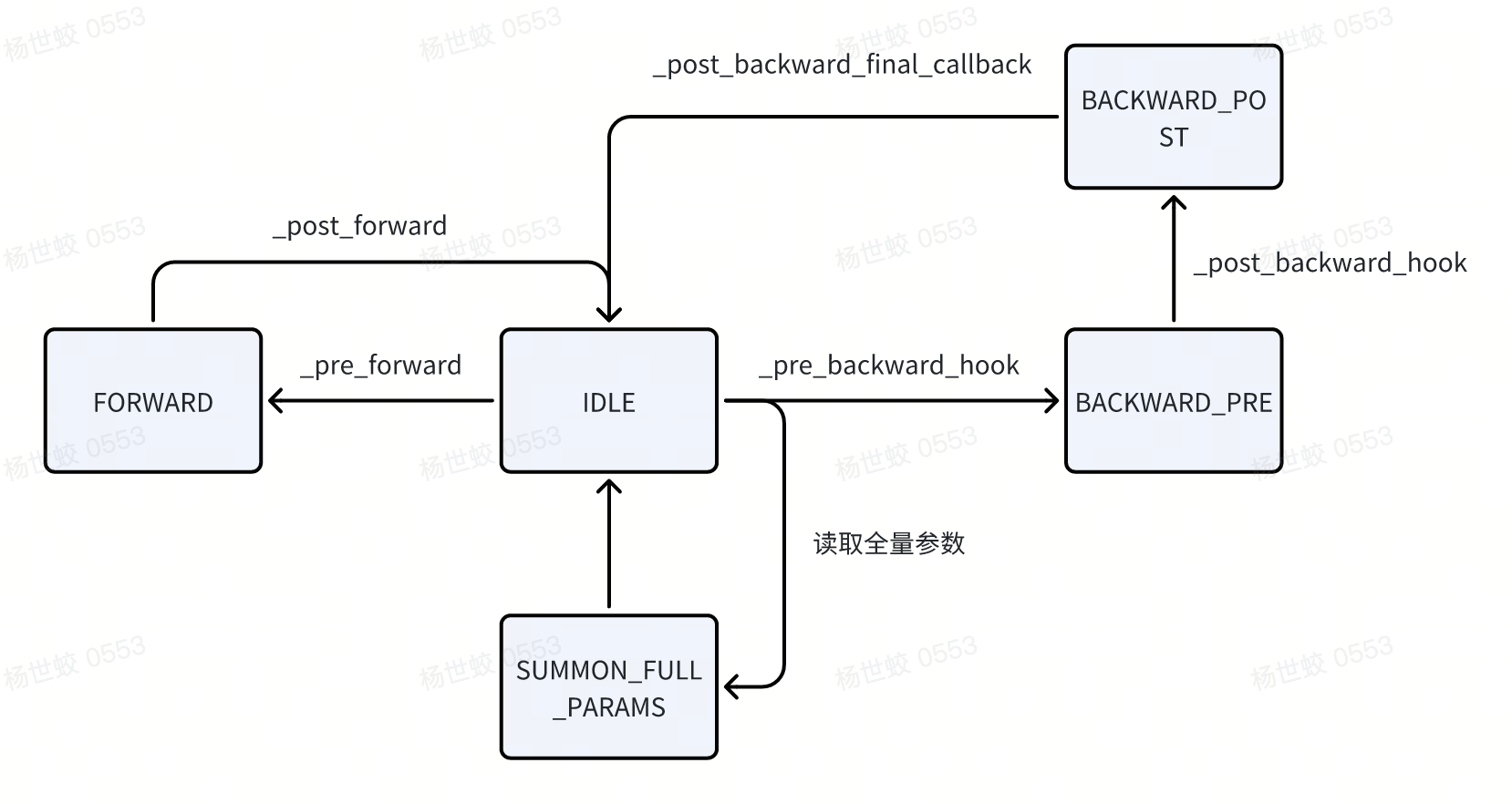 - FSDP state中也有一个training state,不过状态更少,主要是用来做一些入口的检查,防止不合法的状态。相对比较简单。