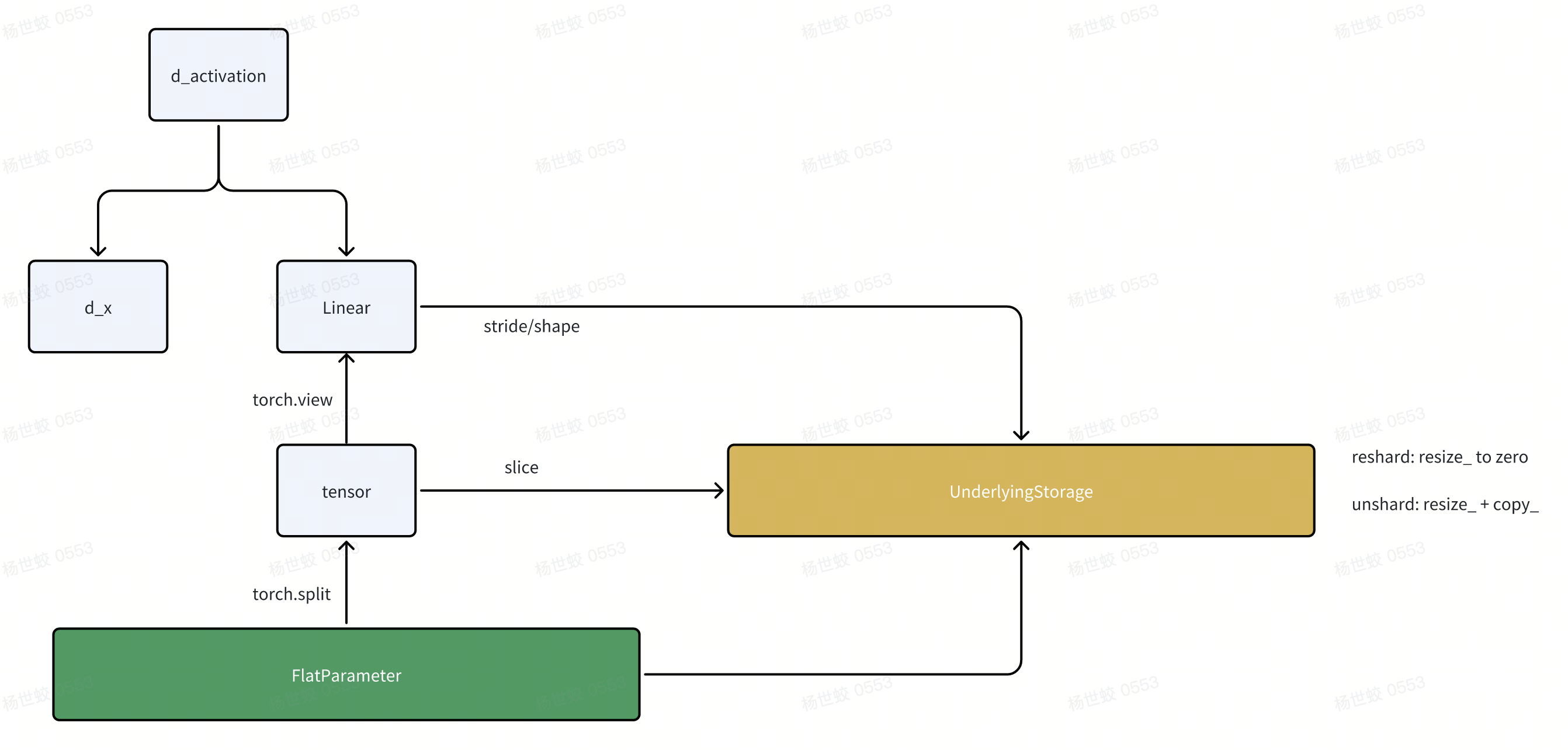 这里的做法是,这些tensor底层会共享相同的一个Storage的对象。上层autograd看到的是这里的tensor,而不会感知底层的Storage。