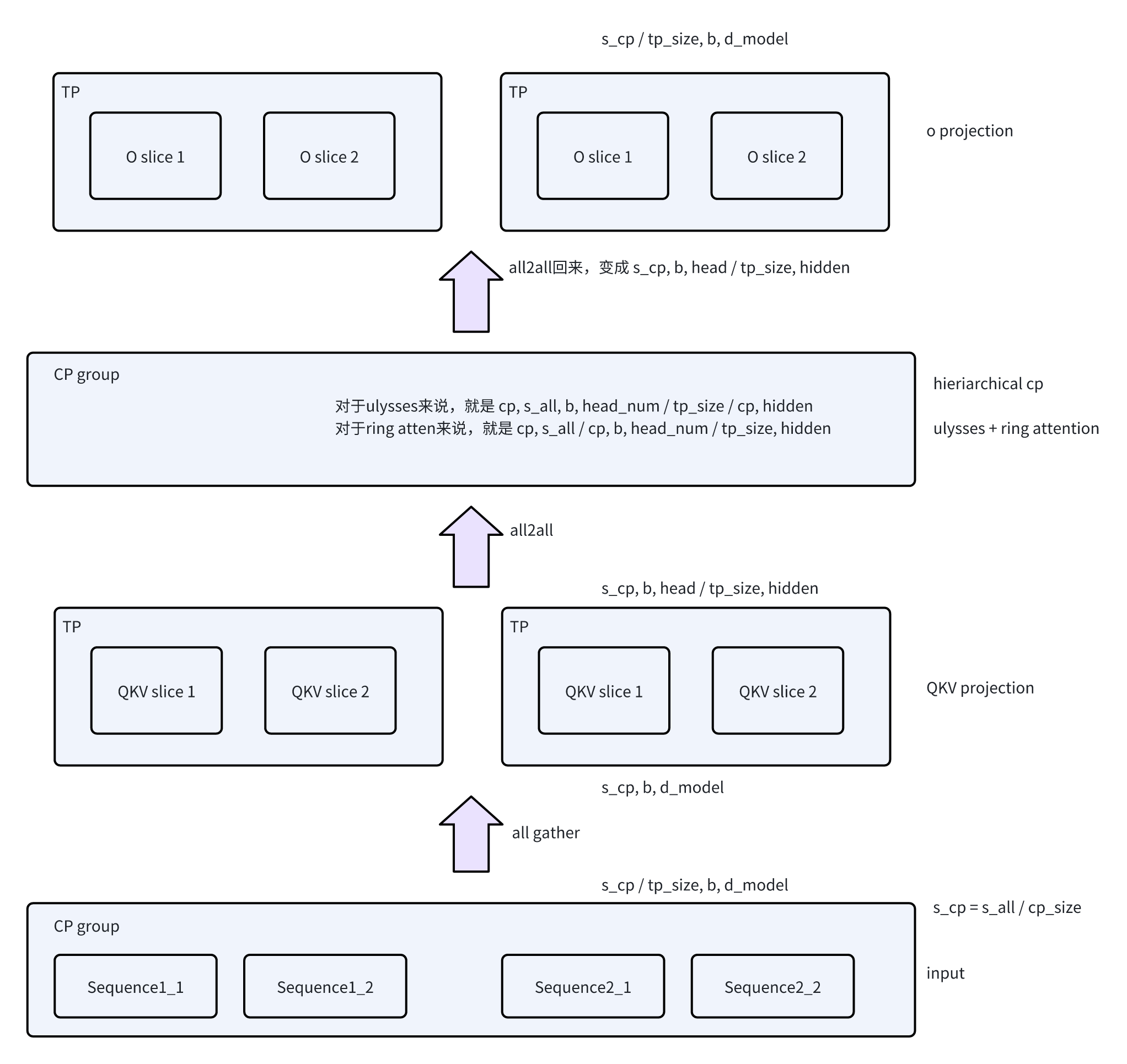 - 对于Attention来说,每一个rank的输出是[s_all / cp_size / tp_size, batch_size, d_model]