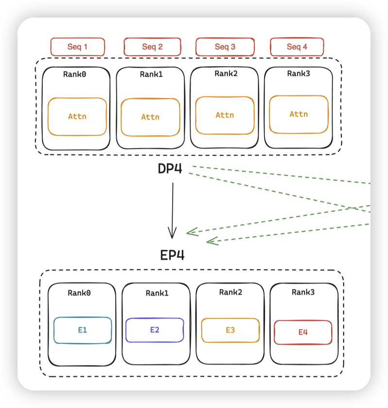 - 对应DP4转成EP4。此时如果希望扩展EP维度来提高效率的话,只能同时扩展DP,来消耗batch size