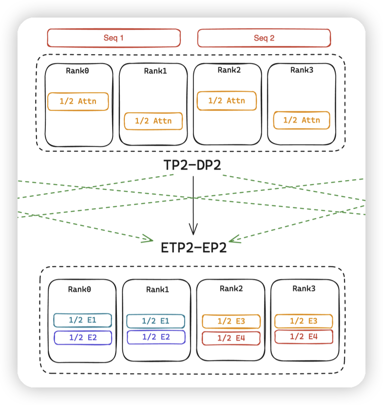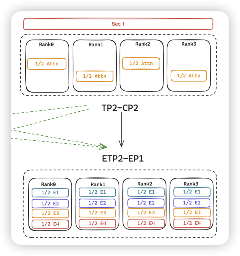 TP2转ETP2,CP2转成了DP2。此时所有rank都被DP/TP吃完,EP只能是1。
