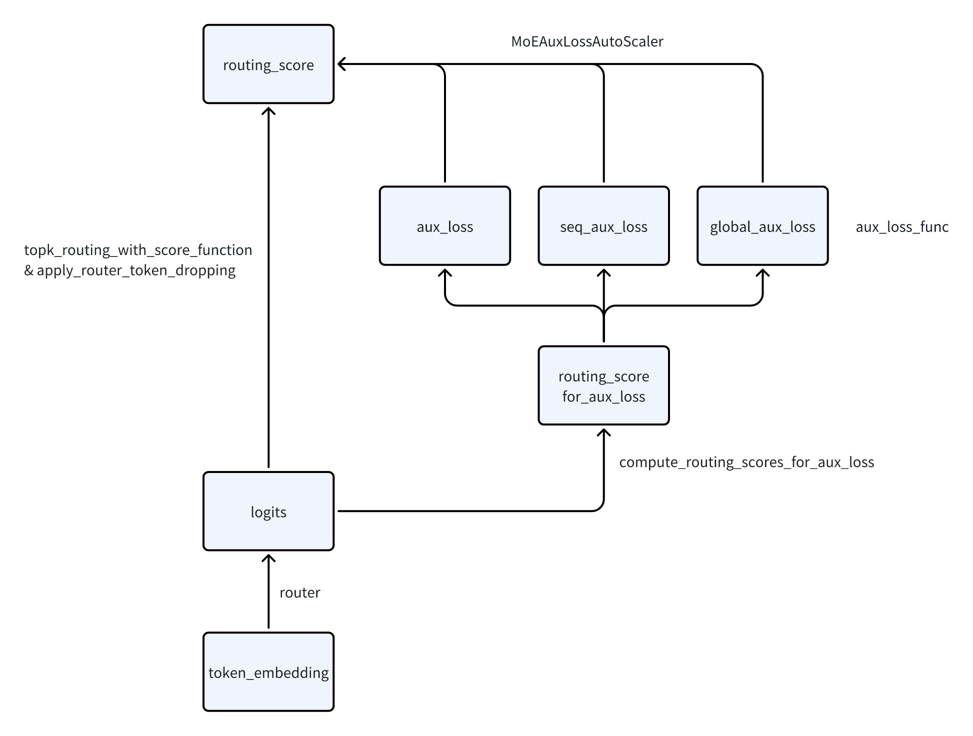 - 在主体的router链路增加了一个旁路,计算aux_loss,并通过MoEAuxLossAutoScaler接回到主链路。