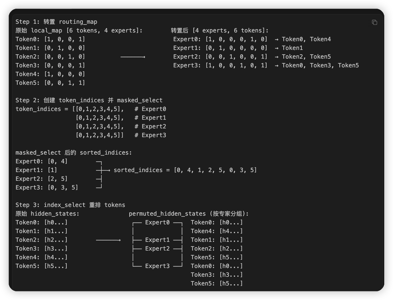 做permute,将token hidden state进行重排,将相同expert的token重排到一起,用于后面的all2all。核心流程如图,claude给画的。