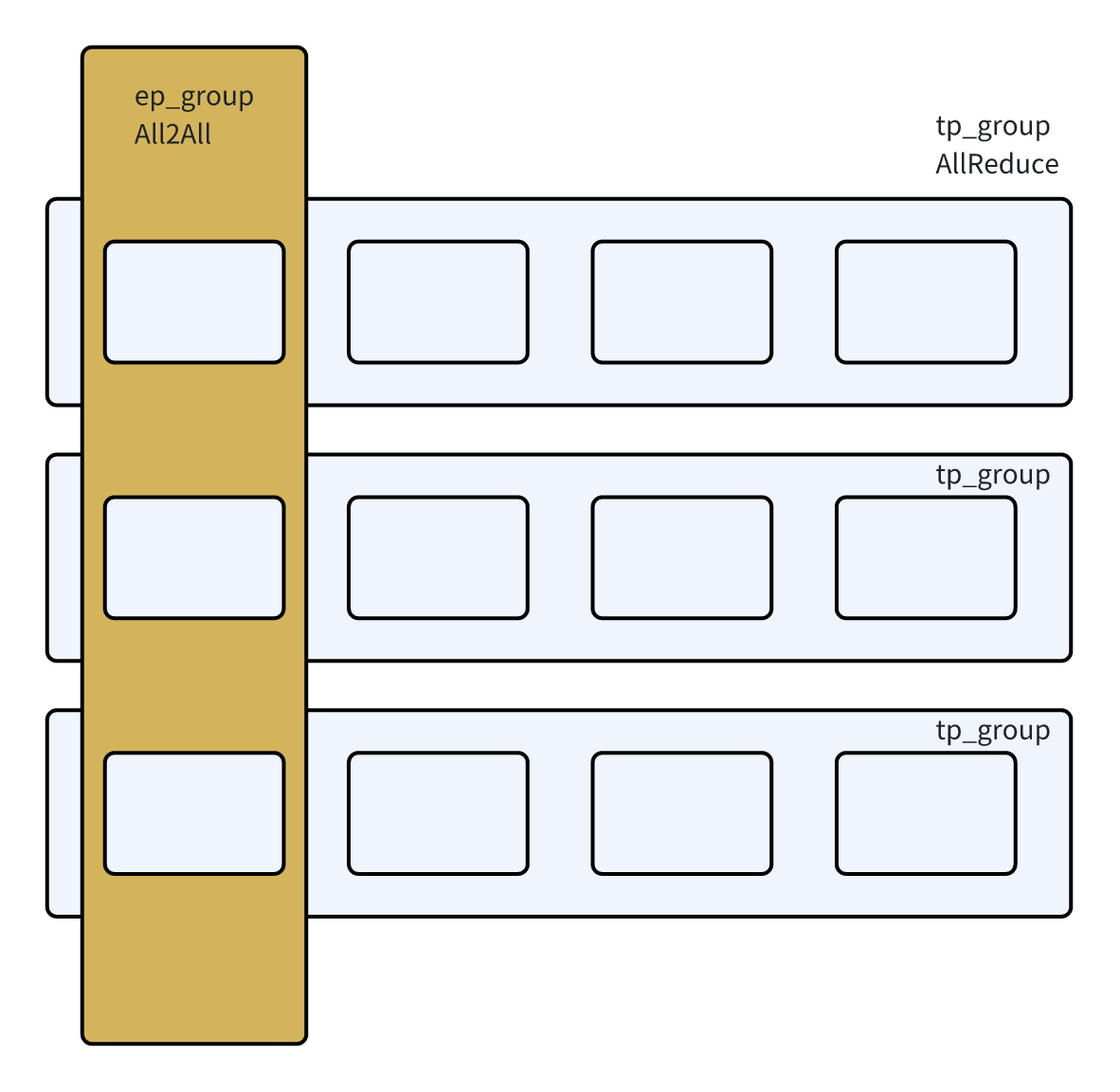 - 在All2All的时候,每个rank会在自己对应的EP/TP group中进行all2all,不同的EDP group之间不会相互通信。