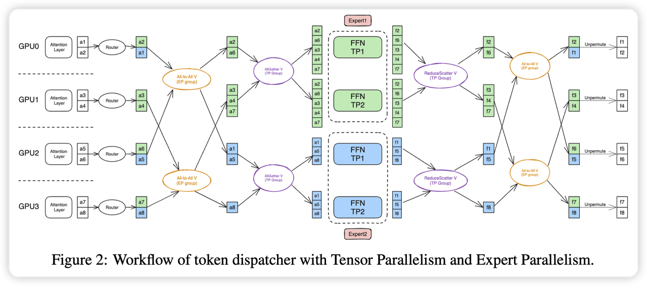 实现上有三个Dispatcher,AllGatherDispatcher比较简单;然后还有优化版本的FlexDispatcher,支持DeepEP;这里我们主要介绍一下比较经典的AllToAllDispatcher