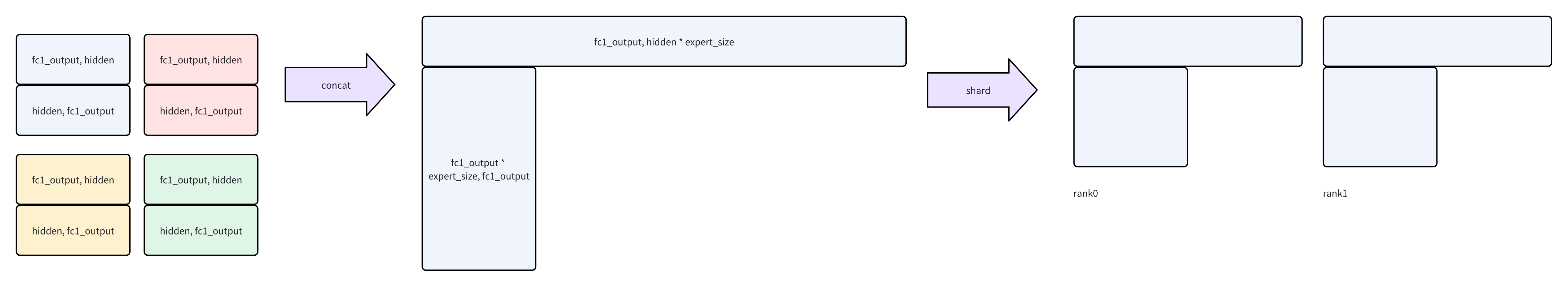 因为MoE的特性(动态路由),这里无法很好的标记每一个Rank的输入形状,这块我们主要来理解一下MLP层做EP的原理。