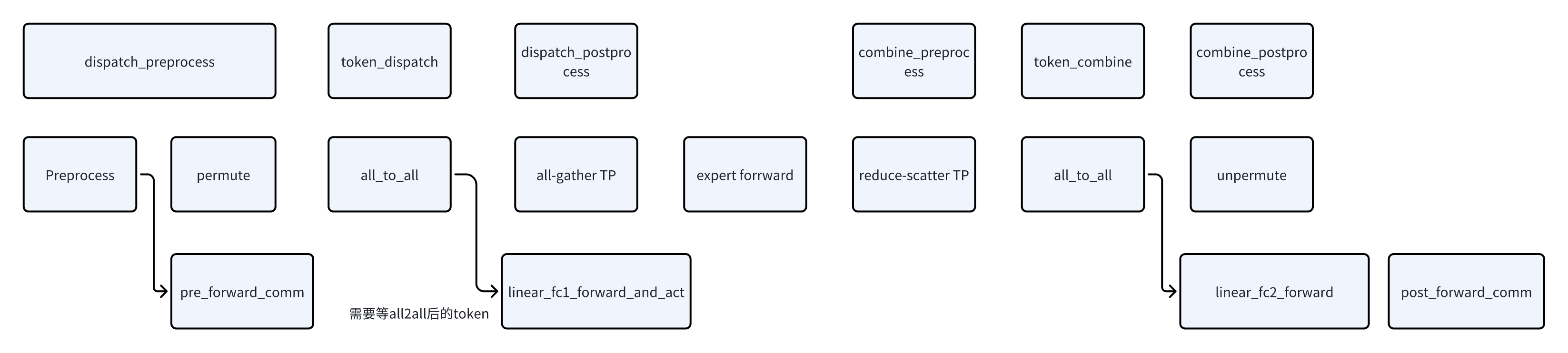 - 因为每个rank都负责独立的一部分token。这里会先在ep_group中做All2All,再在tp_group中做AllReduce