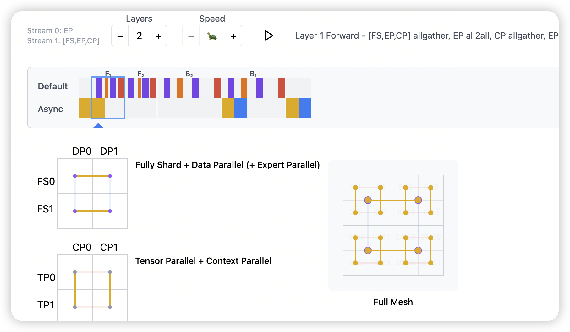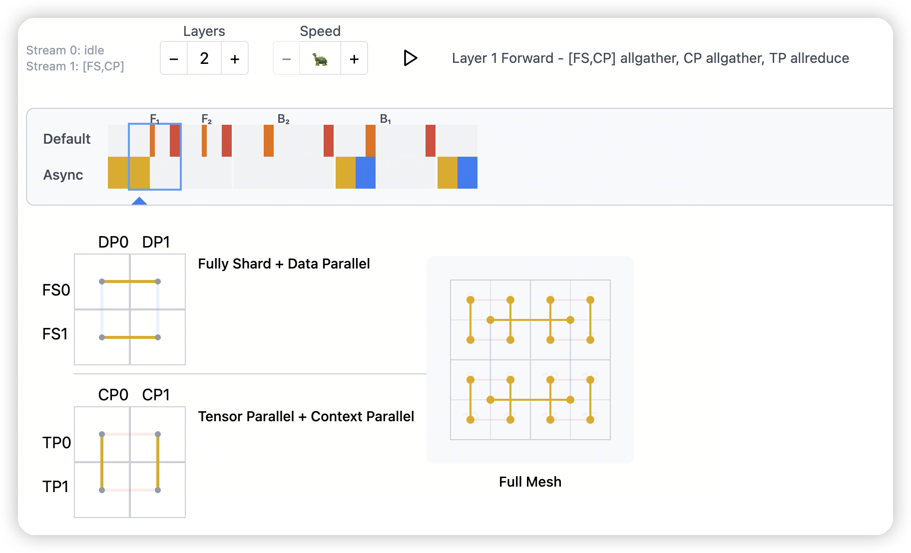 mesh['fs','cp']._flatten('fscp')and passingmesh['fsdp']tofully_shardin PyTorch.- 同样讲了将CP/DP fold到一起,给FSDP用