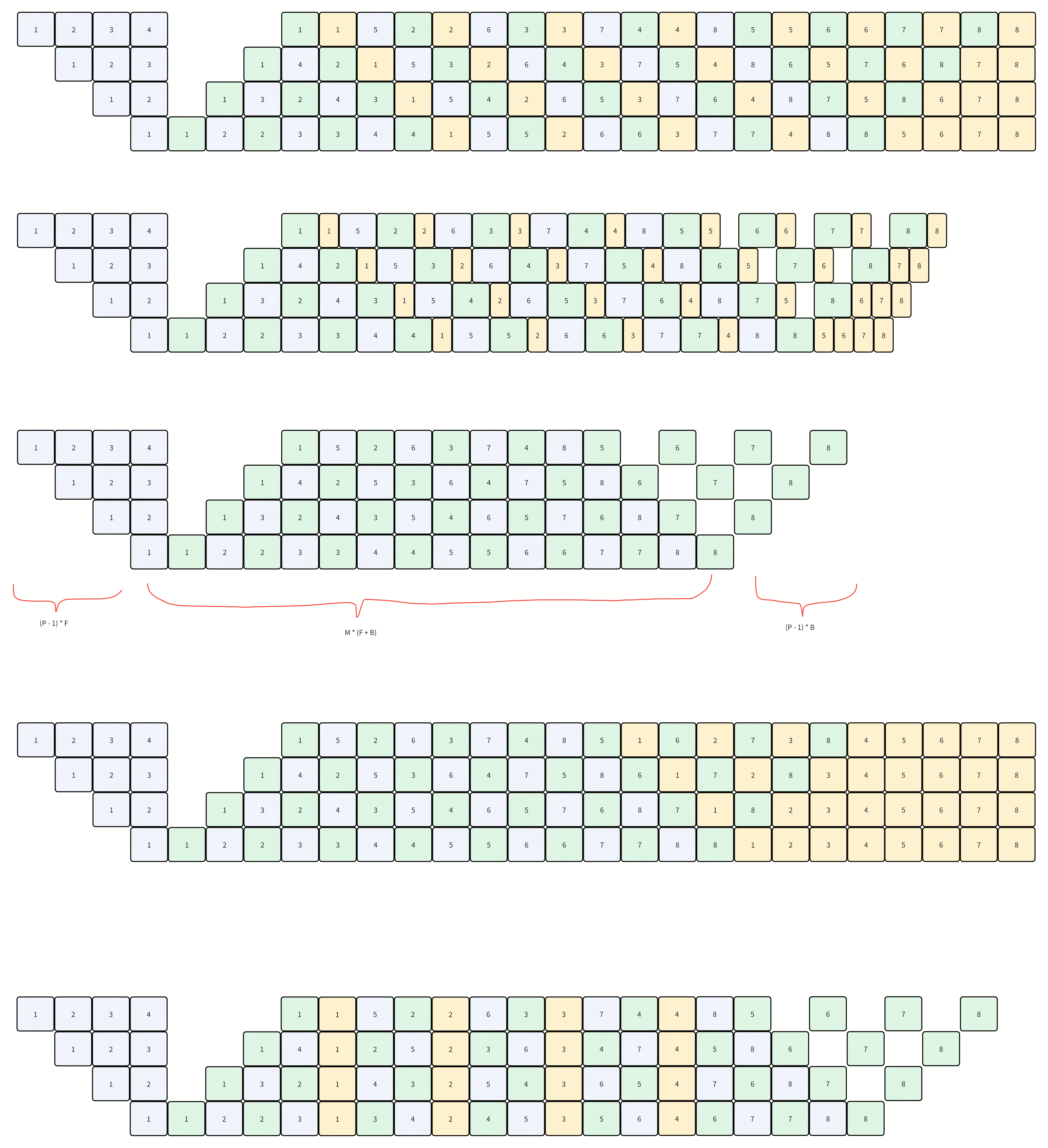 然后这里还有一个问题,就是图四并不是对应论文中的ZB-H1,因为我把所有的W都放到了最后,导致峰值内存会比较高。而原文中把W往前推。效果类似于延长了forward的执行时间,然后到cooldown阶段没有新的forward了之后,W的计算就变成了forward,来填补1F1B的空。