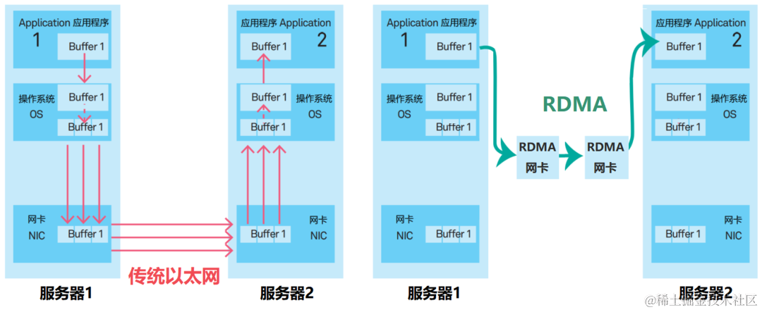 对比传统的网络传输机制,RDMA无需操作系统和TCP/IP协议栈的介入。RDMA的内核旁路机制,允许应用与网卡之间的直接数据读写。