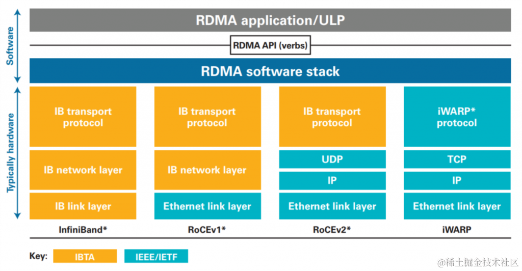 * IB(InfiniBand): 基于 InfiniBand 架构的 RDMA 技术,由 IBTA(InfiniBand Trade Association)提出。搭建基于 IB 技术的 RDMA 网络需要专用的 IB 网卡和 IB 交换机。